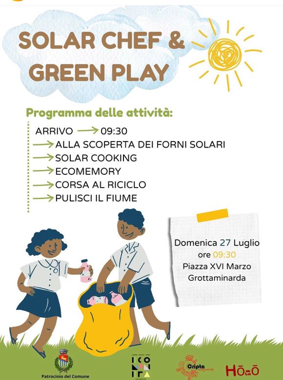 Domenica 27 luglio, a partire dalle ore 9:30, in Piazza XVI Marzo a Grottaminarda, iniziativa dedicata all’ambiente, al gioco e alla creatività: “Solar Chef & Green Play”.
