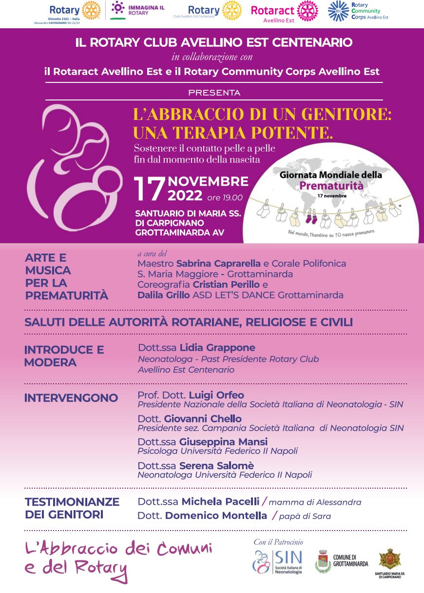 Di questo si parlerà in un’iniziativa prevista proprio per il 17 novembre, alle ore 19,00 presso il Santuario di Carpignano, organizzata dal Rotary Club Avellino Est Centenario con la collaborazione del Rotaract Avellino Est ed Rotary Community Corps Avellino Est, con il patrocinio del Comune di Grottaminarda e della SIN, Società Italiana di Neonatologia.