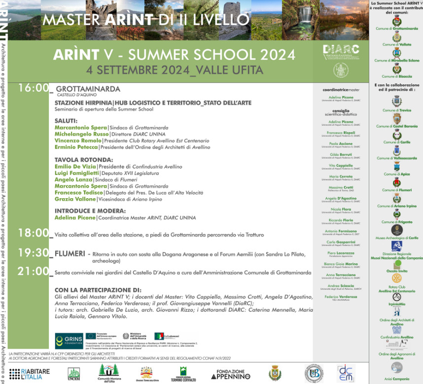Il Comune di Grottaminarda è orgoglioso di preannunciare che partirà dal Castello D’Aquino, alle ore 16:00 di mercoledì 4 settembre, la Summer School “ARÌNT” dell’Università degli Studi di Napoli Federico II.