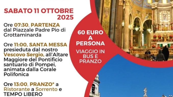 Il programma prevede la partenza alle ore 7:30 dal Piazzale Padre Pio di Grottaminarda. I fedeli raggiungeranno il Santuario Pontificio di Pompei, dove alle 11:00 sarà celebrata la Santa Messa presieduta dal Vescovo Sergio, presso l’Altare Maggiore, con l’animazione della Corale Polifonica parrocchiale.