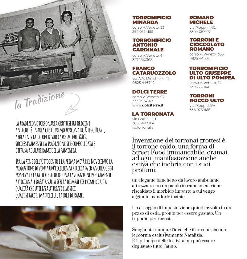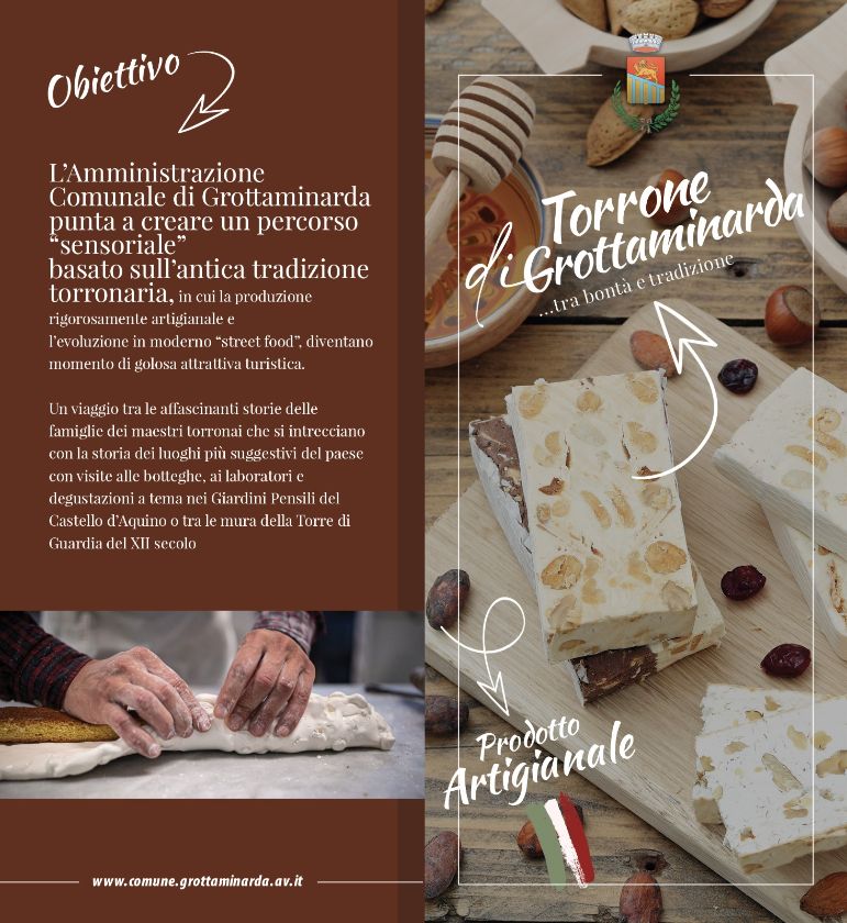 L’Amministrazione Comunale di Grottaminarda punta a creare un percorso “sensoriale” basato sull’antica tradizione torronaria, in cui la produzione rigorosamente artigianale e l’evoluzione in moderno “street food”, diventano momento di golosa attrattiva turistica. Un viaggio tra le affascinanti storie delle famiglie dei maestri torronai che si intrecciano con la storia dei luoghi più suggestivi del paese con visite alle botteghe, ai laboratori e degustazioni a tema nei Giardini Pensili del Castello d’Aquino o tra le mura della Torre di Guardia del XII secolo.