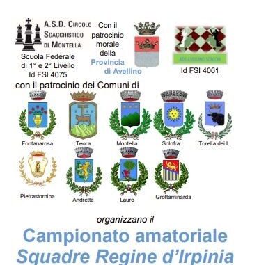 Si svolgerà a Grottaminarda domenica 22 gennaio, la fase eliminatoria del Campionato Amatoriale di Scacchi Squadre “Regine d’Irpinia” a cura dell’ASD Circolo Scacchistico di Montella, Federazione di 1° e 2° livello Id FSI 4075, con il patrocino della Provincia di Avellino e di diversi comuni irpini tra i quali Grottaminarda.
