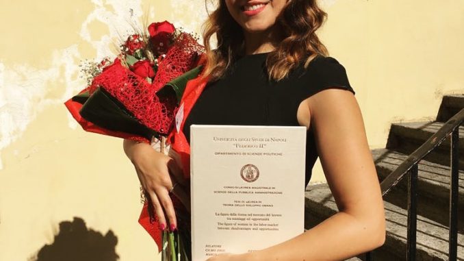 La nostra giornalista Alessia Conte ha conseguito oggi presso l’Università di Napoli “Federico II – dipartimento di Scienze Politiche – ottenendo il massimo dei voti, 110 e lode, la Laurea Magistrale in Scienze della Pubblica Amministrazione, discutendo la tesi in: “La figura della donna nel mercato del lavoro: tra svantaggi ed opportunità”. Gli Auguri Speciali sono da parte di tutta la redazione giornalistica di Bassa Irpinia.