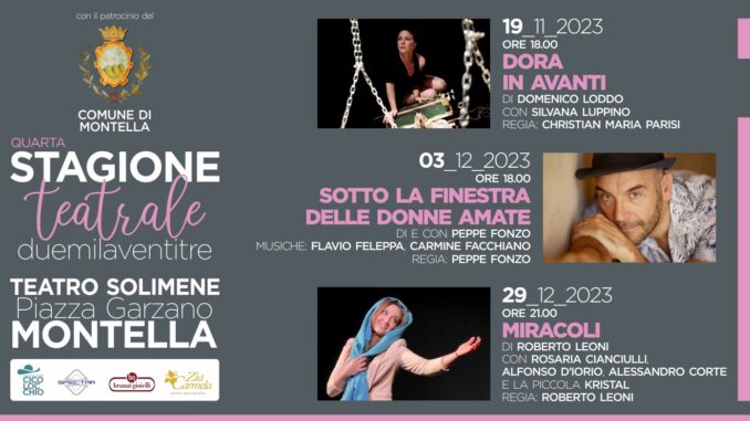 Nell’ultimo evento del mini cartellone ci sarà il ritorno dell’attrice montellese Rosaria Cianciulli che porterà al Solimene lo spettacolo in tre atti unici MIRACOLI, scritto e diretto da Roberto Negri con Rosaria Cianciulli, Alfonso D’Iorio, Alessandro Corte e la piccola Kristal, In scena il 29 Dicembre alle ore 21.00.