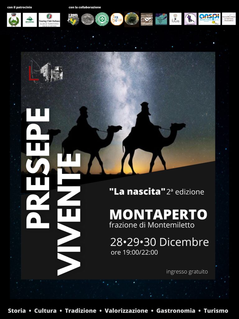 Il suggestivo borgo di Montaperto, frazione del comune di Montemiletto nel cuore dell’Irpinia, verrà avvolto dalla magia del Natale nel mese di dicembre grazie alla seconda edizione del Presepe Vivente- La Nascita. La Pro Loco, in collaborazione con le associazioni del posto e la Parrocchia del SS.Rosario, offrirà ai visitatori la possibilità di condurre un percorso itinerante attraverso le stradine caratteristiche del borgo storico.