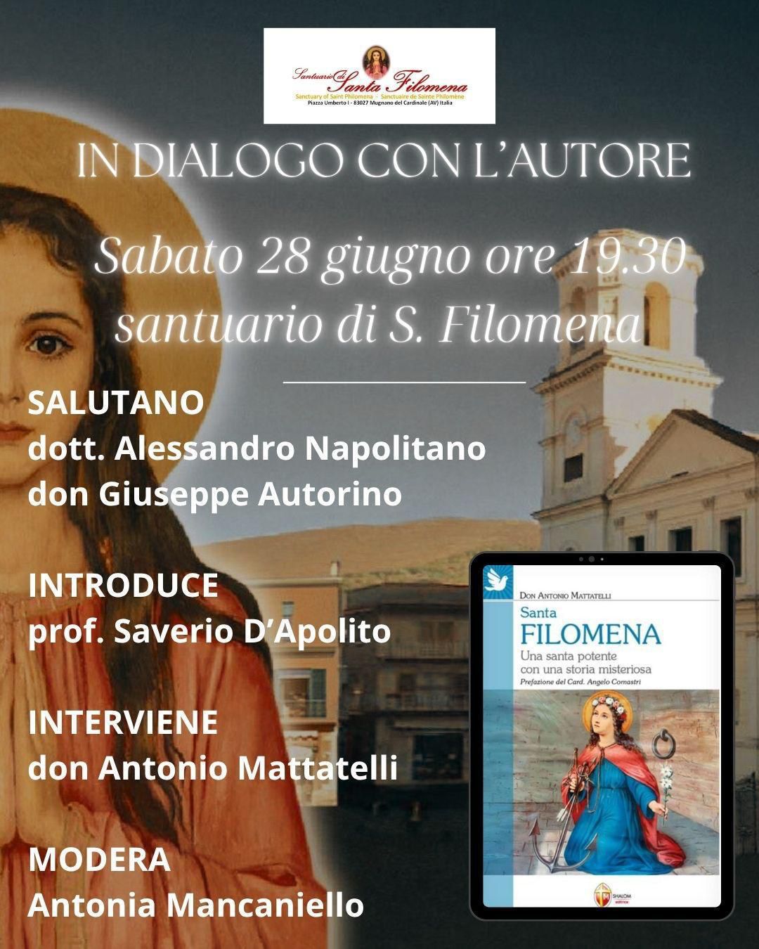 Sabato 28 giugno alle ore 19.30, presso il Santuario di Santa Filomena a Mugnano del Cardinale, si terrà un incontro culturale e spirituale dedicato alla figura della giovane martire, amata e venerata in tutto il mondo. L’occasione è la presentazione del libro di don Antonio Mattatelli, Santa Filomena. Una santa potente con una storia misteriosa, arricchito dalla prefazione del Cardinale Angelo Comastri, che intende riportare all’attenzione dei fedeli la forza interiore e il fascino di questa figura, divenuta simbolo di purezza, coraggio e intercessione.