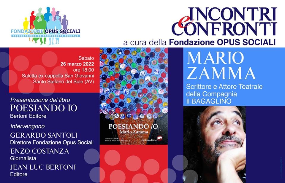 Sabato 26 marzo alle ore 18,00 presso la Saletta della Cappella San Giovanni a Santo Stefano del Sole (AV), nell’ambito della manifestazione “ Incontri e Confronti” si terrà la presentazione del Libro POESIANDO IO (Bertoni Editori) a cura della Fondazione Opus Sociali