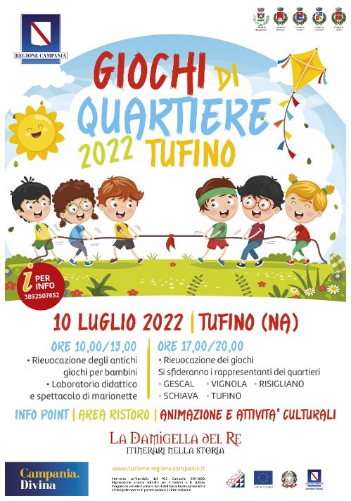 Prende il via l’edizione 2022 dei Giochi di Quartiere di Tufino, tra avvincenti sfide e rievocazione degli antichi giochi tradizionali. L’evento, che si terrà domenica 10 luglio, presso Piazza Gragnano a Tufino (NA), nasce, infatti, per riscoprire valorizzare i giochi di un tempo, volano di valori, anch’essi da riscoprire, come lo stare insieme e il sano e genuino divertimento. Si comincia la mattina, dalle ore 10,00 alle 13,00, con la riscoperta dei giochi in legno riservata ai più piccoli, cui sarà dedicata anche un laboratorio didattico di manualità e uno spettacolo di marionette. Nel pomeriggio, a partire dalle ore 17,00, i giochi di quartiere entreranno nel vivo con la partecipazione dei rappresentanti dei quartieri cittadini, Gescal, Vignola, Risigliano, Schiava e Tufino, che si cimenteranno in varie sfide, quali corsa nei sacchi, corsa carriola e tanti altri. Un’area ristoro, info-point e animazione completeranno la giornata. La partecipazione è gratuita. L’iniziativa è inserita nell’ambito del progetto “La Damigella del Re”, ed è co-finanziata dal POC Campania 2014-2020 – Rigenerazione Urbana, politiche per il turismo e la cultura. Programma unitario di percorsi turistici di tipo culturale, naturalistico ed enogastronomico di portata nazionale e internazionale. L’idea nasce dalla volontà di mettere in rete una serie di manifestazioni, a carattere rievocativo e di tradizione popolare, in un lungo itinerario pensato per offrire ai partecipanti la possibilità di vivere un percorso alla riscoperta della storia e del folklore di questi luoghi. Appuntamento a Tufino, dunque, per i giochi di quartiere 2022.