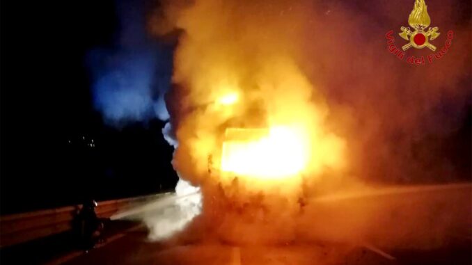 I Vigili del Fuoco di Avellino, alle ore 04’00 di oggi 10 ottobre, sono intervenuti sull’autostrada A 16 Napoli – Canosa, al Km. 70,600, in direzione Canosa, nel territorio del comune di Mirabella Eclano, per un incendio che ha interessato un autocarro che trasportava frutta. La sala operativa del Comando di via Zigarelli, ricevuta la richiesta di soccorso dall’autista, un uomo proveniente da Napoli e diretto a Foggia, ha inviato sul posto la squadra del distaccamento di Grottaminarda, e due dalla sede centrale di Avellino. Il tempestivo intervento ha permesso lo spegnimento delle fiamme, limitandole alla sola motrice del pesante automezzo, e di salvare il carico di frutta. La corsia autostradale in direzione sud, è rimasta chiusa durante le operazioni di soccorso.