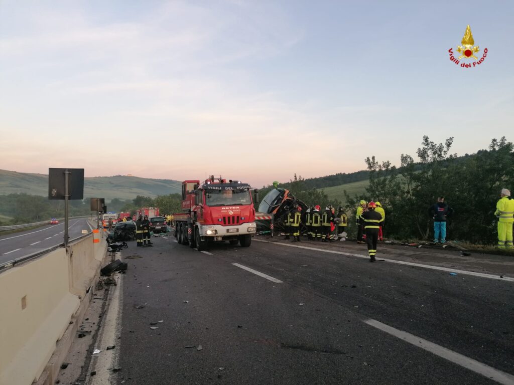 Ancora un tragico incidente che riporta alla mente il tragico volo del bus sul viadotto di Aqualonga di alcuni anni fa che causò la morte di 40 persone. Questa volta il tragico incidente è avvenuto nel territorio di Vallesaccarda sull’A16 direzione Napoli, erano le 4,00 di oggi domenica 4 giugno 2023, quando un incidente autostradale che ha visto coinvolto diversi veicoli e un pullman che trasportava 38 passeggeri e 2 autisti. Coinvolti 5 veicoli oltre al bus che dopo l’impatto è finito in una scarpata. Immediatamente sono stati allertati i soccorsi sul posto ambulanze da tutta la provincia per soccorrere i numerosi feriti, ed un eliambulanza. I feriti sono stati trasportati nei vari ospedali tra Avellino, Benevento, Ariano e in altri nosocomi, qualcuno in gravi condizioni. Fino ad ora si conta una vittima recuperata dai Vigili del Fuoco ma non si esclude che sotto al bus possano esserci altri corpi. Sono in corso le azioni di recupero dei mezzi sul posto le forze dell’ordine che stanno cercando di ricostruire la dinamica del grave incidente. Inoltre allestito un “centro d’accoglienza” a Grottaminarda per tutte le persone coinvolte nell’incidente. Seguiranno aggiornamenti
