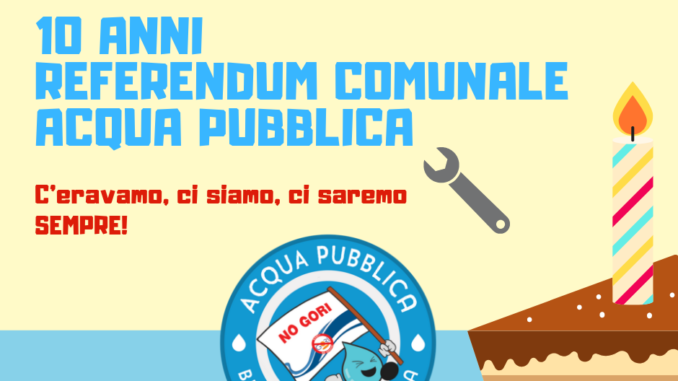 Un’iniziativa per celebrare il 10° anniversario del referendum comunale sull’acqua pubblica che si tenne nel 2008 nella città dei Gigli su iniziativa del comitato cittadino, consultazione popolare che aprì la strada ai successivi referendum nazionali del 2011, ma soprattutto per informare i cittadini sul percorso di approvazione della legge d’iniziativa popolare alla Camera, nonché denunciare le ultime pesanti irregolarità dell’Ente Idrico Campano nel difendere la sciagurata gestione Gori.