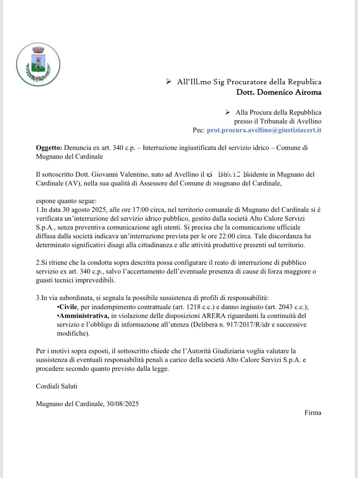 Al momento, da parte di Alto Calore Servizi non è ancora giunta una replica ufficiale. La vicenda apre però un fronte delicato che potrebbe avere sviluppi legali e politici nelle prossime settimane.                                                                                                                                                                                                                                        Acqua interrotta senza preavviso: Mugnano del Cardinale si rivolge alla Procura contro Alto Calore Acqua interrotta senza preavviso: Mugnano del Cardinale si rivolge alla Procura contro Alto Calore Acqua interrotta senza preavviso: Mugnano del Cardinale si rivolge alla Procura contro Alto Calore Acqua interrotta senza preavviso: Mugnano del Cardinale si rivolge alla Procura contro Alto Calore