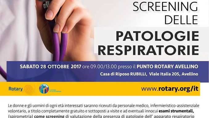 Il 28 ottobre ,dalle ore 9,00 alle 13,00, si svolgerà presso il PUNTOROTARY sito nella Casa di Riposo Rubilli, viale Italia 295, la Prevenzione delle Patologie Respiratorie, grazie alla presenza dei dottori Cirocco ed Areopagita, entrambi pneumologi. Si praticheranno visite specialistiche e spirometrie, con l’aiuto di personale infermieristico e dei Volontari Rotariani e Rotaractiani.