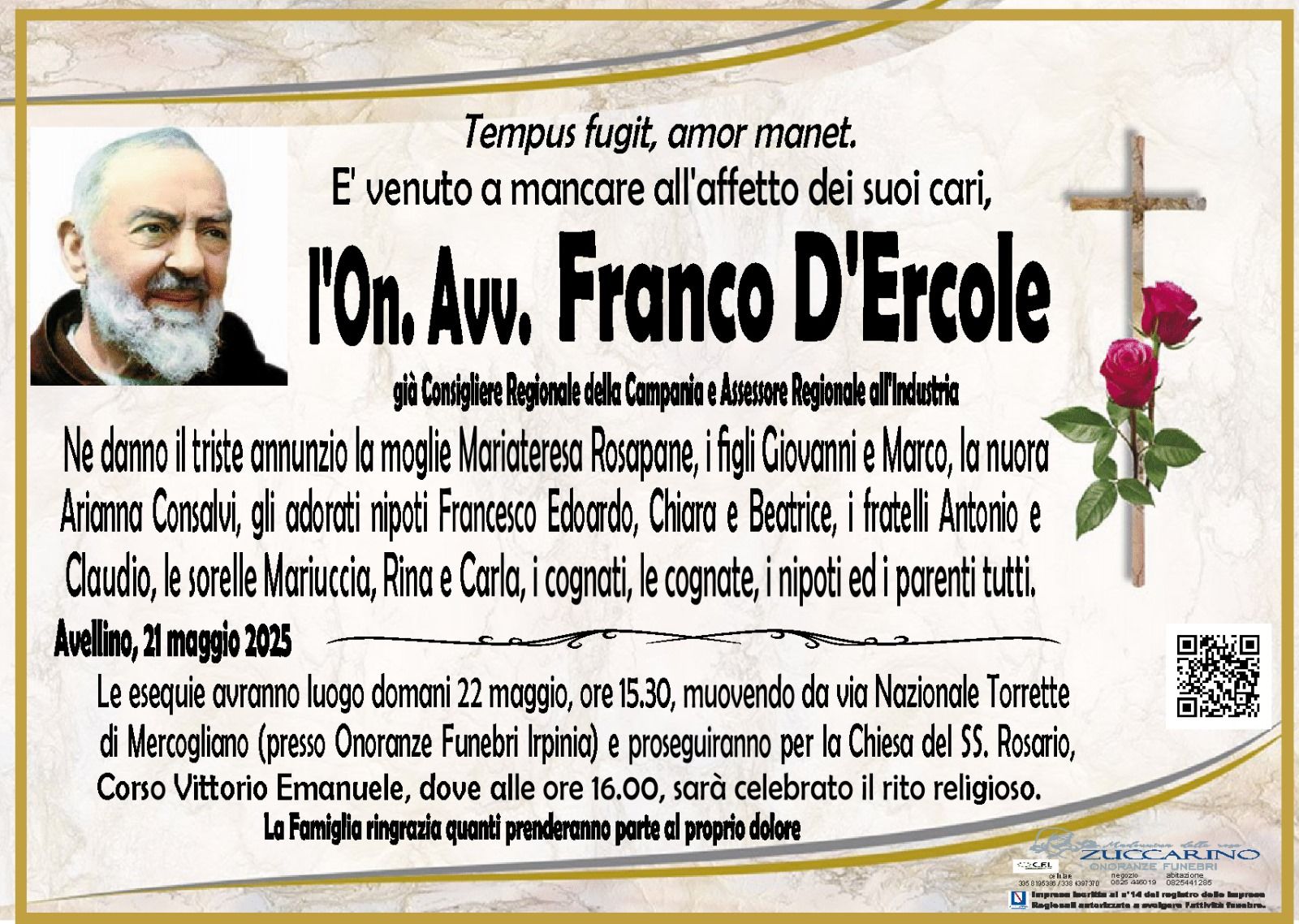 Le esequie si terranno domani, giovedì 22 maggio, alle ore 15:30, con partenza da via Nazionale Torrette di Mercogliano (presso Onoranze Funebri Irpinia) e proseguiranno per la Chiesa del SS. Rosario, in Corso Vittorio Emanuele ad Avellino, dove alle ore 16:00 sarà celebrato il rito religioso.