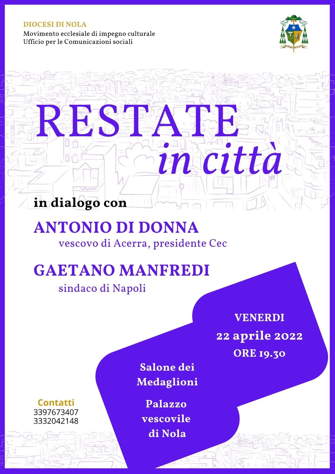 Domani, venerdì 22 aprile, alle ore 19:30, presso il Salone dei Medaglioni del palazzo vescovile di Nola, si terrà il primo appuntamento del ciclo d’incontri Restate in città, promosso dal Movimento ecclesiale d’impegno culturale diocesano (Meic), in collaborazione con l’Ufficio diocesano per le comunicazioni sociali.