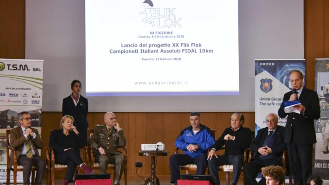 rtura del Villaggio “Cremisi” dove si svolgeranno sfilate di moda, musica, canzoni, itinerari storico-culturali inerenti lo sport nel territorio casertano dalla I Guerra Mondiale ad oggi, realizzazione di un programma alimentare, in coordinazione con la Coldiretti, che tenga conto dell’alimentazione ideale che i ragazzi in età scolastica e/o atleti professionisti di diverse età dovrebbero seguire e che sia correlata ai programmi di allenamento. Il primo giorno, Venerdì 9 ottobre 2020, in concomitanza con l’apertura del Villaggio “Cremisi”, presso il Teatro comunale ci sarà la presentazione delle attività sviluppate dalle scuole, il secondo giorno, sabato 10 ottobre 2020, il Villaggio “Cremisi” sarà dedicato alle esposizioni e alle esibizioni, alle eccellenze del territorio, alle ONLUS; infine, il terzo giorno, domenica 11 ottobre 2020, prenderà il via la manifestazione podistica vera e propria con il Campionato Nazionale Assoluto, Promesse e Juniores Km 10 su Strada (valido come 3^ prova del C.D.S. Assoluto di Corsa) e Campionato Italiano Individuale Allievi di Corsa su Strada (Km 10 A/i Km 6 A/e); Campionato Italiano Esercito 10 Km; Passeggiata Amatoriale 5 Km; Passeggiata amatoriale 1 Km “Corri con mamma, papà e Fido”. L’evento, che è stato ripreso oggi in diretta Facebook dalla Società “Capri Event”, ed anche successivamente nel corso della tre giorni della Flik Flok, potrà essere visto in diretta sui canali 271 e 898 del digitale terrestre. Il tavolo dei relatori ha, naturalmente visto la partecipazione del padrone di casa, il Generale di Brigata Domenico CIOTTI, Comandante della Brigata Bersaglieri “Garibaldi”, dell’Assessore allo Sport del Comune di Caserta dr. Alessandro PONTILLO, in rappresentanza del Sindaco Carlo MARINO che ha incontrato precedentemente il Generale Ciotti, la dr.ssa Luisa FRANZESE, Direttrice Generale dell’Ufficio Scolastico Regionale della Campania, Sandro DEL NAIA Presidente della FIDAL Campania, Michele DE SIMONE Responsabile Provinciale del CONI di Caserta e il Tenente Colonnello Domenico DI PALO, Presidente del Gruppo Sportivo ASD “Garibaldi”. A presentare gli ospiti ed a fare da moderatore l’attore e voce ufficiale dell’Esercito Gabriele BLAIR. Nel suo intervento il Generale Ciotti ha posto l’accento sull’importanza della “Flik Flok” come “…. Momento di aggregazione che ha lo scopo precipuo, la mission di promuovere la cultura dello Sport, il senso dello Stato e le potenzialità del territorio casertano, valorizzando il contributo che le istituzioni offrono al vivere comune. Non avremmo partecipato se non ci fosse stato questo coinvolgimento sociale. Il coinvolgimento dei giovani è il “core business”, è l’elemento cardine intorno al quale ruotano le progettualità che la Flik Flok esprime. Non a caso” – ha aggiunto – “sono impegnate 14 istituti scolastici di Caserta e provincia nella realizzazione di 10 progetti da sviluppare insieme. Lo scopo sociale della XX edizione della Flik Flok è stato il coinvolgimento delle scuole nel Comitato Organizzatore, l’interazione tra Brigata “Garibaldi” e tessuto sociale, la diffusione dei Valori (Istituzione, Patria, Territorio) anche attraverso attività ludico/sportive, lo Sport per tutti e la sinergia tra enti pubblici e Privati. Il Campionato Nazionale Assoluti, che riguarda, si distanze diverse anche le Promesse e Juniores e Allievi, è, in definitiva” – ha ribadito il Generale Ciotti – “una opportunità per il territorio che vedrà la partecipazione di migliaia di atleti provenienti da tutt’Italia”. Un riferimento speciale “… per la partecipazione del Comitato Paralimpico, perché la Flik Flok è caratterizzata anche da “opportunità di inclusione e condivisione”. Nel prosieguo, il Comandante Ciotti ha annunciato che la Brigata, con la sua organizzazione, parteciperà al “Golden Gala” di Napoli ed è in programma anche l’ideazione, preparazione e lancio di una scarpa da atletica denominata, appunto, “Flik Folk”. Una notizia molto interessante che sicuramente avrà un grande impatto tra tutti i “runners” italici. Gli Istituti scolastici che parteciperanno al Comitato Organizzatore ed ai 10 progetti ad ciascuno di loro assegnati sono: ISISS Terra di Lavoro di Caserta, Liceo Giannone (Classico-Scientifico-Classico