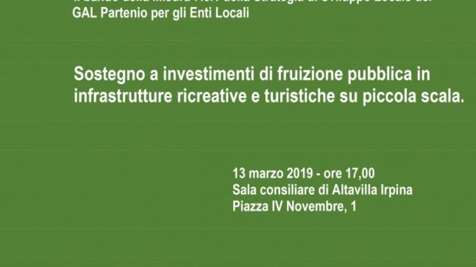 – Domani (mercoledì 13 marzo), alle ore 17, presso la sala consiliare di Altavilla Irpina, incontro con i sindaci della SSL (Strategia di Sviluppo Locale) del Gal Partenio, per illustrare il bando della Misura 7.5.1 “Sostegno a investimenti di fruizione pubblica in infrastrutture ricreative, informazioni turistiche e infrastrutture turistiche su piccola scala” della Strategia di Sviluppo Locale Terre del Partenio”, rientrante nel Programma di Sviluppo Rurale Campania 2014/2020. Con l’incontro di domani il Gal Partenio entra nel concreto delle attività per incrementare la partecipazione dei beneficiari ai bandi della Strategia di Sviluppo Locale “Smart Land”. Gli incontri tecnici con gli enti locali nascono, infatti, per facilitare la redazione dei progetti e la presentazione delle domande di sostegno, oltre che ad illustrare i dettagli di natura tecnica del bando e i relativi adempimenti amministrativi.