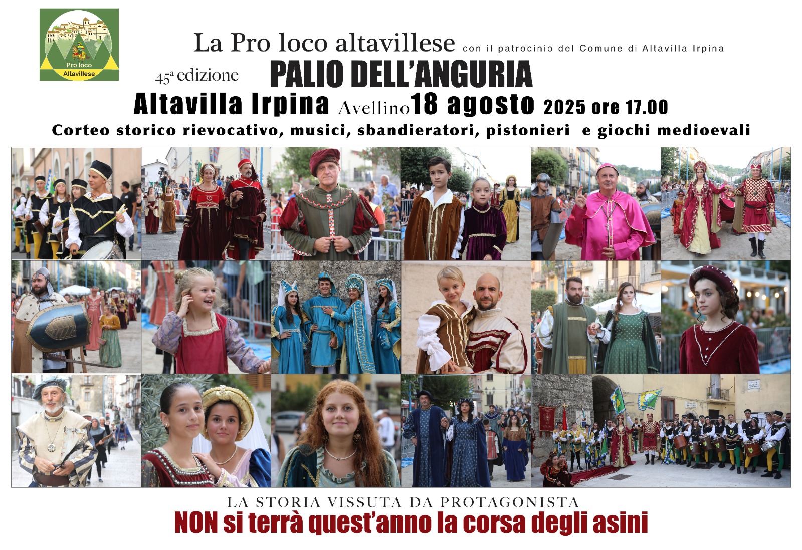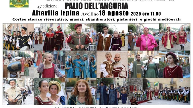 Altavilla Irpina (Avellino) Il Palio dell’Anguria, appuntamento che da 45 anni rievoca la figura di Costanza di Chiaromonte, regina delle Due Sicilie, torna con il tradizionale corteo storico. L’edizione 2025, in programma il 18 agosto a partire dalle 17, avrà come filo conduttore lo slogan “La storia vissuta da protagonisti”, un invito alla partecipazione attiva rivolto dalla Pro Loco di Altavilla a tutta la comunità.