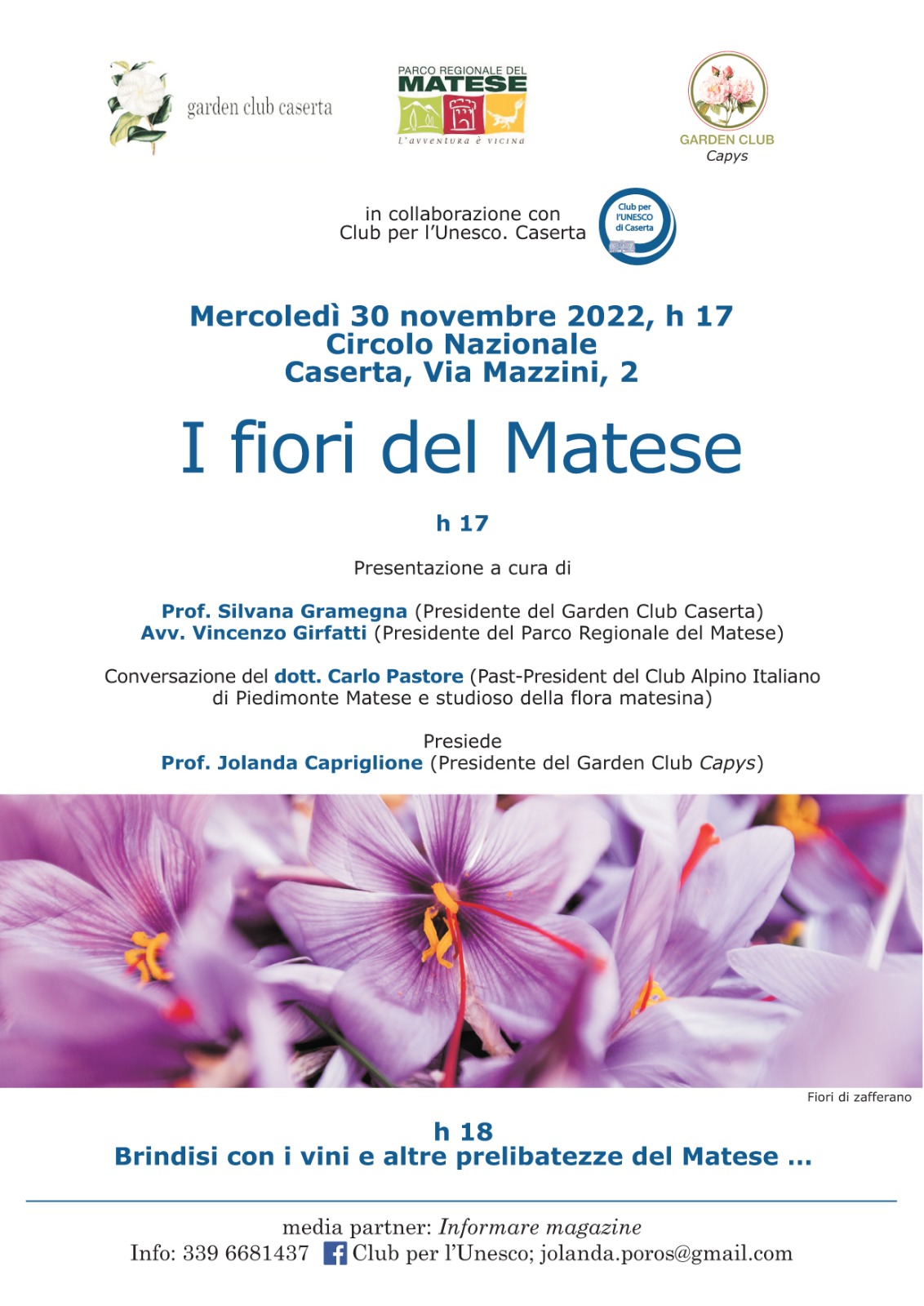 Segnaliamo quest’iniziativa del Parco Regionale del Matese e promossa dal Garden Club di Caserta, Garden Club Capys e dal Club per l’Unesco in cui si discuterà della flora del Matese. Tra gli interventi, anche quello del past-president del Club Alpino Italiano di Piedimonte, Carlo Pastore, autore insieme alla moglie Giulia d’Angerio di un libro sull’argomento.