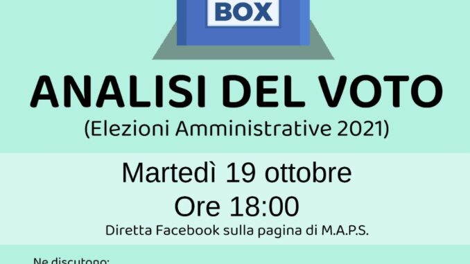 Il convegno online “Analisi del voto – Elezioni amministrative 2021” organizzato da Maps (Movimento attivo politico e sociale) in collaborazione con il “Centro Studi Fiorentino Sullo” si svolgerà nel pomeriggio dalle 18 in diretta Facebook sulla pagina del movimento.