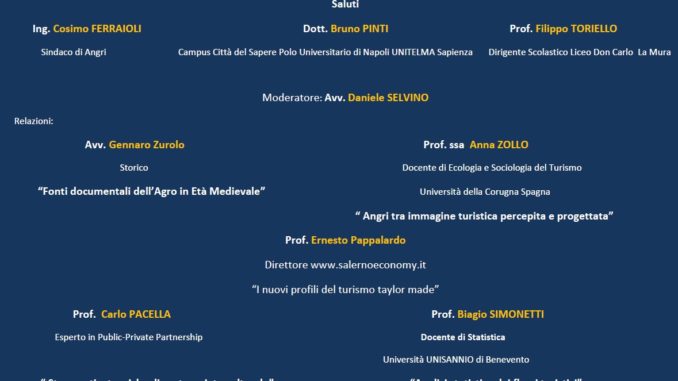 Dopo i saluti del sindaco di Angri Ing. Cosimo Ferraioli, del dott. Bruno Pinti di Unitelma Sapienza e del Prof. Filippo Toriello, dirigente scolastico del liceo “La Mura” di Angri, i lavori del convegno si svolgeranno con gli interventi dei seguenti relatori: Avv. Gennaro ZUROLO Storico “Fonti documentali dell’Agro in Età Medievale”
