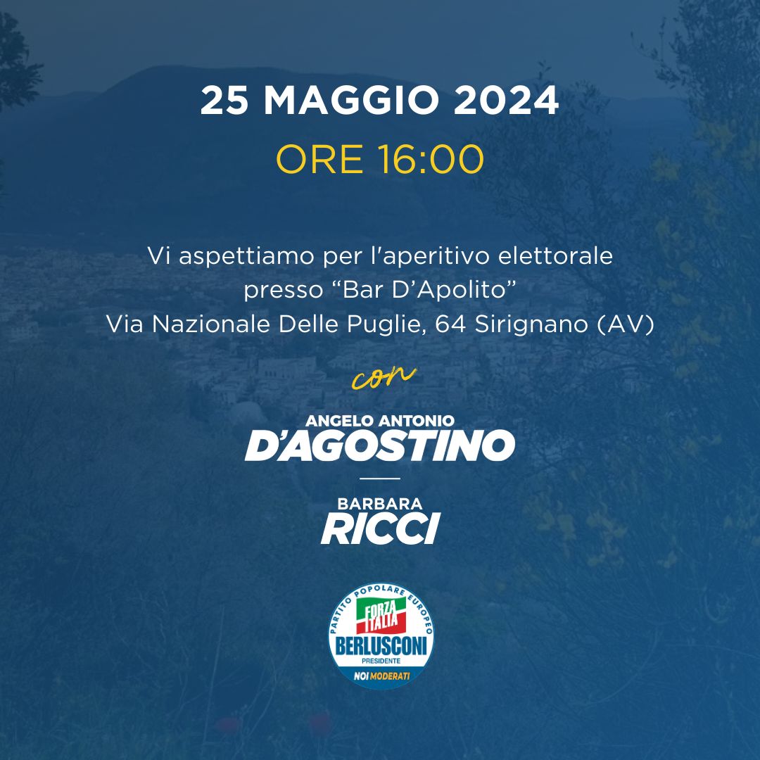 Sabato 25 maggio alle ore 16, presso il bar D’Apolito di Sirignano (AV), il Presidente dell’Avellino Calcio e candidato al Parlamento Europeo, Angelo Antonio D’Agostino, incontrerà militanti, simpatizzanti, giovani ed elettori di Forza Italia per un aperitivo elettorale.