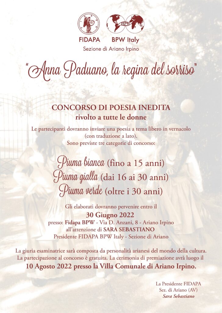 La FIDAPA Sezione di Ariano (AV) con il Patrocinio della FIDPA BPW – Italy Distretto Sud- Ovest, indice 1ª Edizionedel concorso di poesie inedite dedicato ad “Anna Paduano, laregina del sorriso” e rivolto a tutte le donne.