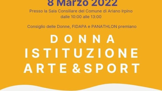 In occasione della giornata internazionale delle donne, martedì 8 marzo 2022, dalle 10:00 alle 13:00, presso la sala consiliare “Giovanni Grasso” del Comune di Ariano Irpino, il Consiglio delle Donne, la Fidapa e il Panathlon club premiano la Donna nelle Istituzioni, nell’Arte e nello Sport con il patrocinio del Comune di Ariano Irpino.