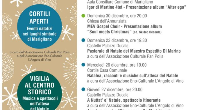 Dopo “Alla Corte del Gusto”, attività collaterale con cui è stato inaugurato il periodo delle festività natalizie nella Città di Marigliano, il festival Marigliano in Jazz torna per una ricca edizione invernale, grazie alla positiva sinergia tra l’Associazione Culturale Skidoo, promotrice e organizzatrice del festival dal 2007, e il Comune di Marigliano, beneficiario di un finanziamento regionale ottenuto anche grazie alla longevità della manifestazione musicale. In tale contesto, l’edizione Winter del Marigliano in Jazz si arricchisce di eventi e iniziative collaterali, quali “Cortili Aperti”, “Urban Art Project” e la “Vigilia di Natale al Centro Storico”, creando una rassegna che tiene insieme arte, cultura e tradizioni natalizie. Quattro gli appuntamenti previsti dalla rassegna Jazz invernale, che saranno ospitati il 21, 28 e 29 dicembre presso l’Aula Consiliare del Comune di Marigliano e il giorno 30 dicembre presso la Chiesa dell’Annunziata. Il programma di questa speciale edizione natalizia, come sempre caratterizzato da qualità e varietà, è improntato maggiormente alla promozione di progetti originali che sapranno coinvolgere gli appassionati del genere e non solo. Le attività natalizie pensate per animare la città proseguiranno sabato 22 dicembre, alle ore 11,00, presso il centro storico con l’“Urban Art Day”, evento di presentazione e installazione delle opere vincitrici del concorso di Street Art bandito dal Comune di Marigliano. Dal 23 al 26 dicembre sarà la volta, invece, di “Cortili Aperti”, rassegna natalizia ambientata in alcuni dei luoghi simbolo del Comune di Marigliano. Si comincia il giorno 23, alle ore 19,30, presso il Castello Ducale con l’Apertura della Mostra “C’era una volta Marigliano” e Mostra Mercato del Collezionismo, cui si accompagnerà la Pastorale di Natale del Maestro Espedito Di Marino, a cura dell’Associazione Culturale Pan Polis. Il 26 dicembre, alle ore 19,00, presso il Cortile della Casa Comunale, sarà la volta di “Natalea” – Racconti e musiche sull’attesa del Natale, e il 27 dicembre, alle ore 20,00, di nuovo presso il Castello Ducale, si terrà lo spettacolo itinerante “A Nuttat’ e’ Natale”. Entrambi gli appuntamenti sono a cura dell’Associazione Eno-Culturale L’Angolo di Vino. Infine, grande festa il 24 dicembre, a partire dalle ore 13,00, in occasione della Vigilia di Natale, per le vie del Centro Storico e Piazza Annunziata con lo spettacolo itinerante della Conturband e l’esibizione del Blue Gospel Singer. A questi appuntamenti si aggiungono, inoltre, gli ulteriori eventi previsti dalla rassegna “Natale insieme a Marigliano”, sempre promossa dall’Amministrazione Comunale. Tante le occasioni, dunque, per vivere un Natale all’insegna del divertimento per tutti i gusti, dagli amanti della musica a quelli delle tradizioni tipiche dell’atmosfera di questo magico periodo che contribuirà anche a valorizzare alcuni luoghi simbolo della Città di Marigliano.