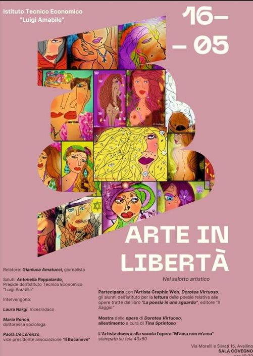 Si svolgerà il 16 maggio 2023 ore 10.30 ad Avellino l’evento !Arte in libertà” ideato dall’artista Graphic web Dorotea Virtuoso in collaborazione con l’istituto ‘Tecnico Economico Luigi Amabile” con allestimento a cura di Tina Sprintoso