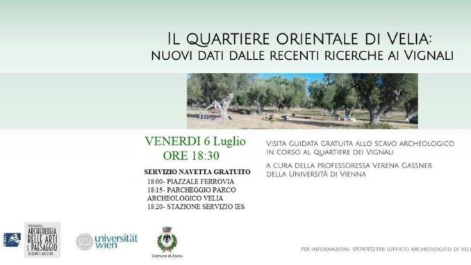 Venerdì 6 luglio 2018, alle ore 18.30, la Soprintendenza Archeologia Belle Arti e Paesaggio di Salerno e Avellino, diretta da Francesca Casule, in collaborazione con l’Università di Vienna e il Comune di Ascea, ha organizzato una visita guidata gratuita allo scavo archeologico in corso nel quartiere dei Vignali nell’area del Parco Archeologico di Velia a cura della prof.ssa Verena Gassner (Università di Vienna), responsabile scientifico delle indagini.