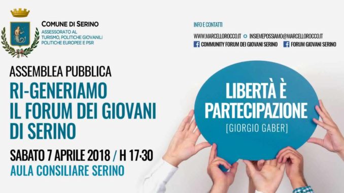 Sabato 7 Aprile, alle ore 17.30, presso l’Aula Consiliare del Comune di Serino avrà luogo l’Assemblea Pubblica dal titolo: “Ri-Generiamo il Forum dei Giovani di Serino” promossa dall’Amministrazione Comunale attraverso l’Assessorato alle Politiche Giovanili.