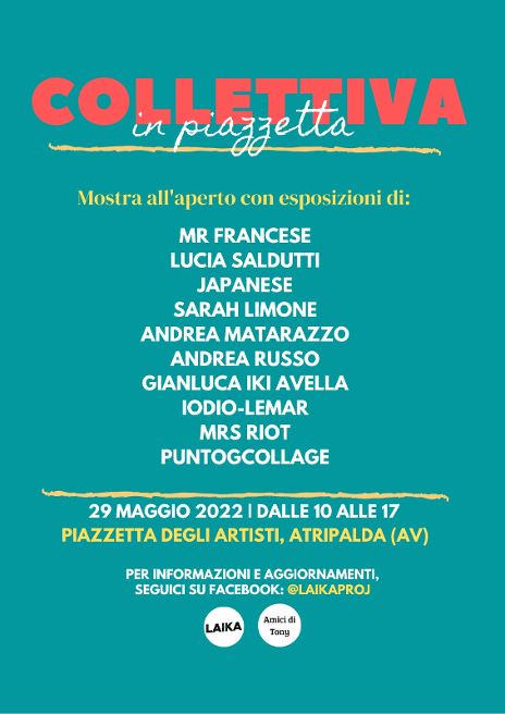 “Collettiva in piazzetta”, questo il nome dell’iniziativa lanciata dall’associazione culturale Laika. Undici artisti per svariate forme di arte: partecipano Mr. Francese, Lucia Saldutti, Japanese, Sarah Limone, Andrea Matarazzo, Andrea Russo, Gianluca Iki Avella, Iodio e Lemar, Mrs Riot, Puntogcollage. Le opere spaziano dalla pittura a olio, al fumetto, ai disegni per tattoo, oltre a incisioni e sculture.