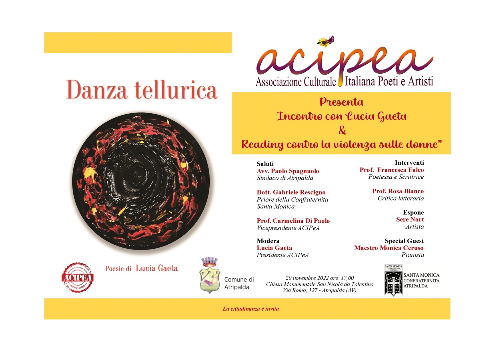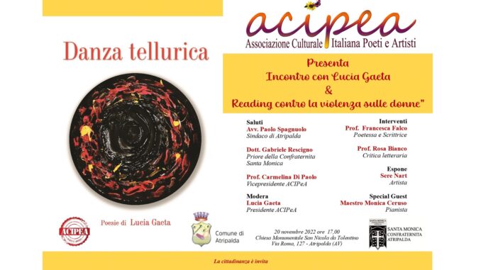 Sarà presentato domenica 20 novembre ore 17, 00 il libro “Danza tellurica” di Lucia Gaeta presso la Chiesa Monumentale di San Nicola da Tolentino ad Atripalda in via Roma.