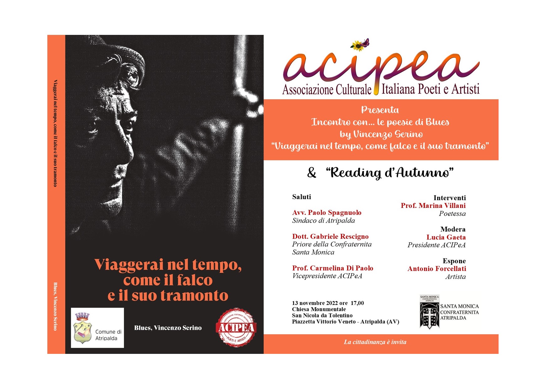 Si svolgerà presso Chiesa di San Nicola da Tolentino ad Atripalda domenica 13 novembre dalle ore 17.00 alle 19.30 l’incontro con … le poesie di Blues – (Vincenzo Serino) tratte dalla silloge “Viaggerai nel tempo, come il falco e il suo tramonto”.