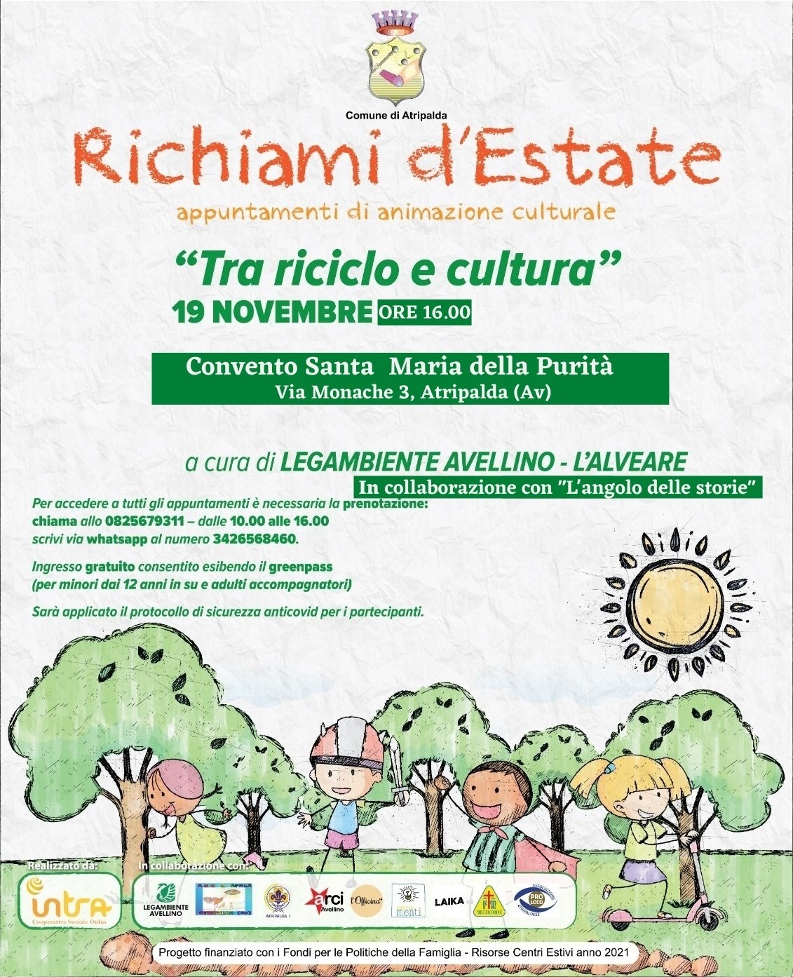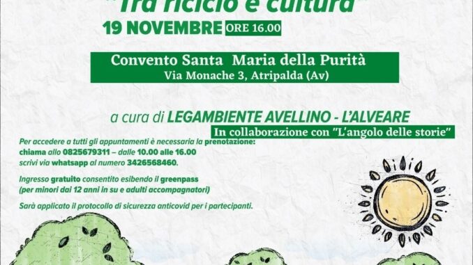 Si terrà venerdì 19 novembre alle ore 16:00 , al Convento Santa Maria della Purità ad Atripalda un appuntamento con “Tra riciclo e cultura” organizzato da Legambiente Avellino e il Comune di Atripalda, con la partecipazione de “L’Angolo delle Storie”.