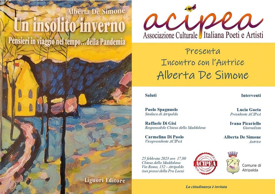 Tutto pronto per la presentazione del libro “Un insolito inverno”- ed. Liguori, della pregevolissima Alberta De Simone con il Primo Incontro con l’Autore – ACIPeA 2023, in programma per il 25 Febbraio ore 17,00, presso la Chiesa della Maddalena in Via Roma, 152 ad Atripalda.