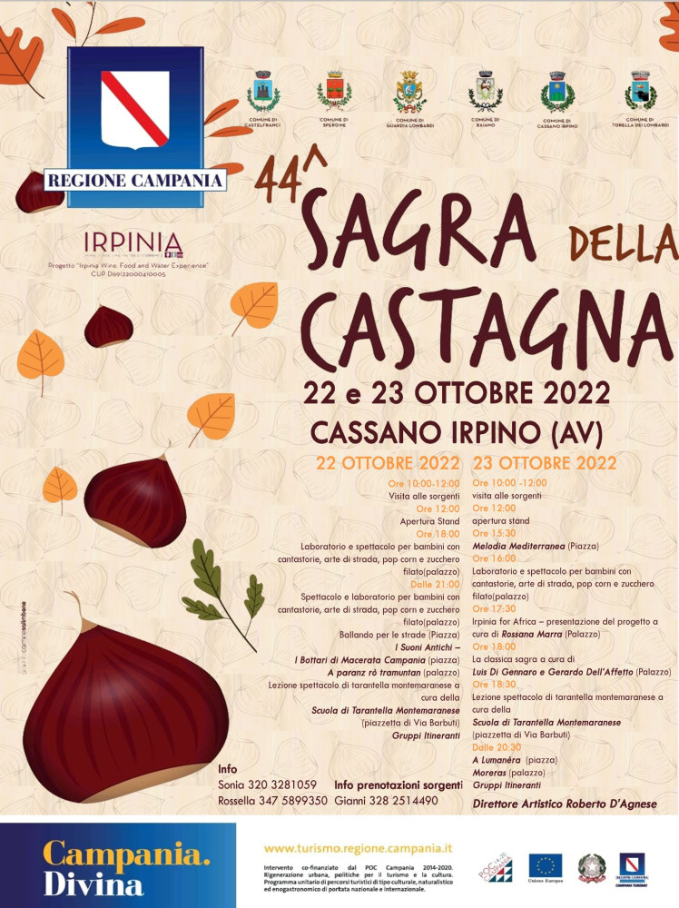 AVELLINO) – L’autunno in Irpiniaha il sapore del bosco. Tra gli appuntamenti da non perdere c’è la 44esima Sagra della Castagna di Cassano Irpino, in programma sabato 22 e domenica 23 ottobre nello splendido borgo della provincia di Avellino, promosso dal Comune di Cassano Irpino nell’ambito del POC Campania 2014-2020 insieme ai Comuni di Castelfranci, Sperone, Guardia Lombardi, Baiano e Torella dei Lombardi.