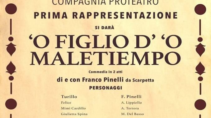 “ A distanza di nove anni- ha dichiarato FrancoPinelli, attore, autore e regista, volto ben noto nell’ambito del cinema e teatro partenopeo oltre che nazionale- rimetto in scena ‘O Figlio d’ ‘O Maletiempo, una mia riduzione de ‘ ‘O tuono ‘e marzo di VincenzoScarpetta. Il mio intento nel mettere in scena una commedia, che ben esprime lo stile e il linguaggio “scarpettiano” – chiarisce, Pinelli– è quello di non far dimenticare negli anni a venire, ma anche in quelli attuali, il Teatro di una volta, quello che dà all’attore la possibilità di esprimersi con tutta verve e vena creativa di cui si vale e dispone, per formazione e sentimenti. Nella riduzione che ho inteso realizzare, ho inserito elementi di leggerezza, conservando inalterati il racconto e i personaggi della commedia. Un atto d’omaggio al Teatro di tradizione, ma anche il senso della vicinanza al sentire dei nostri giorni”.