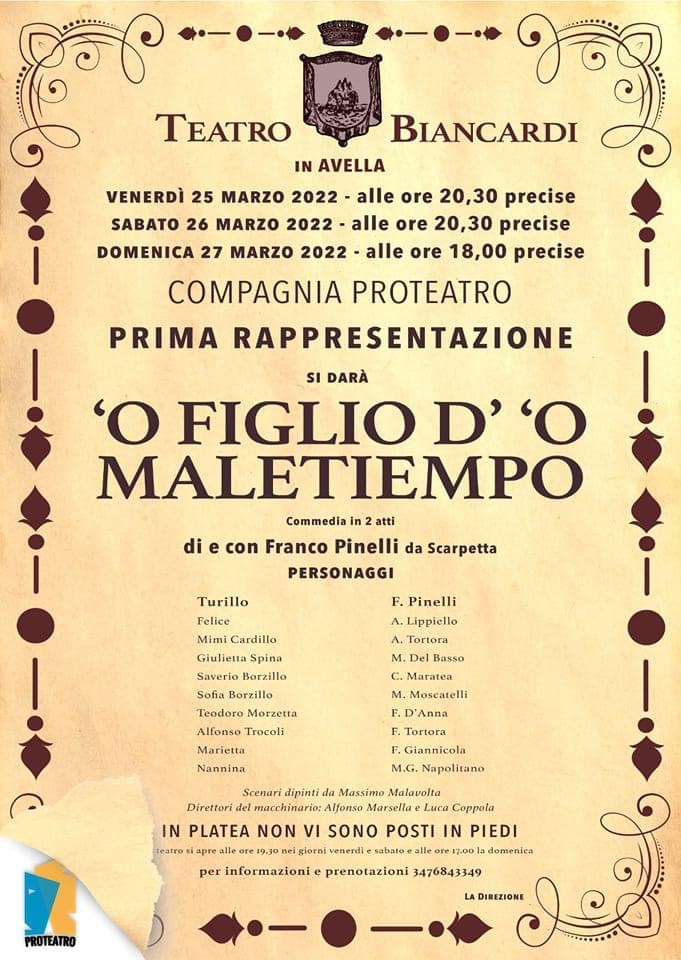In scena, sarà proposta la commedia di VincenzoScarpetta, intitolata ‘O Figlio d’ ’O Maletiempo, in due atti, con regia e riduzione– rispetto ai tre atti originari- di Franco Pinelli, che interpreta il ruolo di Turillo. E con Pinelli, sulla ribalta del Biancardisaranno – per un cast che conta dieci interpreti- AntonioLippiello, Marina Del Basso e Felice D’Anna. Gli scenari d’ambientazione sono stati dipinti da MassimoMalavolta, mentre la direzione dei macchinari scenografici e delle luci è affidata a Luca Coppola e Alfonso Marsella.