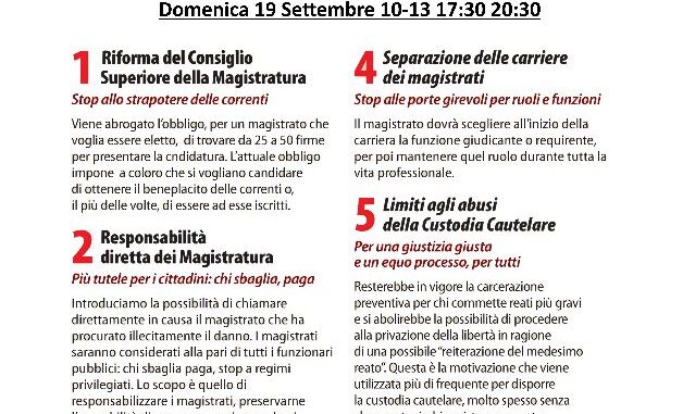 Centro Studi per Avella ha organizzato in Piazza Municipio, per oggi sabato 18 Settembre dalle ore 17 e 30 alle ore 20 e 30 e Domenica 19 Settembre 2021 dalle ore 10 e 00 alle 13 e dalle ore 17 e 30 alle 20 e 30 una raccolta firme a sostegno dei sei referendum sulla giustizia promossi a livello nazionale dal Partito Radicale e dalla Lega. Ci teniamo altresì ad informarvi che in caso di condizioni metereologiche avverse sarà possibile sottoscrivere i sei quesiti referendari presso la sede del Centro Studi per Avella Libera Partecipazione ubicata in Via Roma n 44.