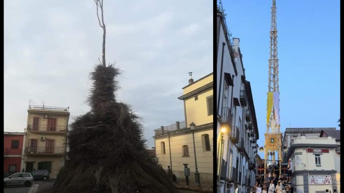 La festa dei gigli é forse fra le feste più antiche della Campania si svolge dal 400 d.c ed in onore di San Paolino che curiosamente non é il patrono della città. Una festa che nei secoli ha oltrepassato i confini nolani raggiungendo la ribalta non solo a livello regionale o nazionale ma addirittura internazionale, ottenendo l’iscrizione al Patrimonio Culturale Immateriale dell’umanità dell’UNESCO nel 2013. Un riconoscimento che ha dato alla festa stessa un peso specifico nella storia delle macchine a spalle. Con i gigli la città di Nola si colora un mese intero. Giugno é Nola in Campania, ed una serie di eventi accompagnano il popolo nolano e non, fino alla ballata di fine giugno. “Il giorno del cielo”, così ribattezzato. Il trasporto del Majo e il fucarone sono un evento assai diverso, meno arzigogolato ma facente parte del patrimonio folkloristico-culturale campano. Alcuni giorni prima della discesa il popolo recandosi fra i monti cittadini sceglierà il “major” da trasportare, l’arbuato più grande. Il giorno del taglio ci si recherà in montagna la mattina presto, dopo la previa benedizione degli attrezzi, e si provvederà al taglio. Una volta trasportato e portato in paese sarà issato e ricoperto di fascine di legno, senza le quali non si potrebbe dar luce al “fucarone”, tutto in onore di San Sebastiano, questa volta si, santo patrono del paese. Basterebbero queste poche righe per evidenziare le forti differenze fra le due feste. Diverse nelle modalità di svolgimento, nella durata ma un elemento comune c’è ed é evidente entrambe partono da un grande arbusto di legno.