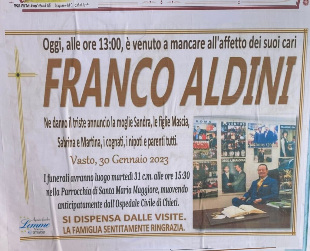 Franco Aldini fu invitato in molte trasmissioni televisive inserendosi nello star system degli anni ’80 – ’90 -2000. In televisione si segnalano presenze a “Fantastico”, “Ora di Punta” (con Mara Venier), “Uno Mattina” (con Maria Teresa Ruta), “Pronto La Rai” (con Giancarlo Magalli) e “Verissimo” (con Cristina Parodi). La Grande Bellezza Romana degli anni ’80 – ’90 è lontana dal paesello natale, Rotondi (Av) suo padre morì solo a 38 anni ed era anche lui sarto, quando a causa del decesso fu costretto a trasferirsi ad Avella il paese dei nonni, ed aveva solo 4 anni. I suoi ricordi erano quelli della povertà degli anni post guerra a cui è molto legato. All’età di 10 anni finita la 5 elementare inizia a fare il pendolare da Avella a Napoli, per la gavetta da sarto: “imparare il mestiere” si diceva un tempo. I suoi ricordi erano legati ad un’infanzia e un’adolescenza molto difficile: sveglia al mattino dalle ore 5.00, per rientrare spesso in tarda serata, attorno alle 22.00, dove ad attenderlo, la sua cara mamma che gli faceva trovare il pasto del giorno. Tutto questo fino all’età dei 17 anni poi lo ritroviamo a Roma, presso la Sartoria Angelo Litrico, per migliorare ed affinare l’arte della sartoria. La parentesi romana fu segnata sempre da grandi sacrifici: condivideva in 4 una stanza, pagando il proprio vitto con le mance dei suoi primi clienti. Terminata la leva militare, aprì la sua prima sartoria a Pomezia, in seguito a Roma, dove conobbe l’attore americano Anthony Quinn diventando il suo sarto personale per ben 35 anni, curando anche gli abiti del film “Il Sindaco” di Pupi Avati e regia di Ugo Fabrizio Giordani. Ha fatto vestiti per tutti i calciatori e allenatori: da Diego A. Maradona a Juan Sebastián Verón, Hugo Almeida, David Platt, Sven-Göran Eriksson, la colonna della nostra nazionale Gianluigi Buffon. Ai mister Eugenio BERSELLINI, Massimo ODDO, all’ing. Dino VIOLA Presidente della Roma e Silvano Ramaccioni. Un particolare rapporto ho avuto con Enzo Bearzot, Carlo Ancelotti, Giampiero Boniperti. Grandi Sportivi come Pietro Mennea, Marco Pantani. Il sarto Franco Aldini realizzò anche quelle che erano le divise dell’Avellino di VINICIO, e tanti altri. Ma non finisce qui fu vestì anche il conterraneo Massimo Troisi. Era fiero del suo lavoro al punto che affermava: “Sono fiero della mia galleria fotografica con questi personaggi, perché come con tutti i miei clienti, mi piace andare oltre il “confezionare un abito”: mettere a proprio agio ed entrare in confidenza, stringere amicizia e suggellarla con un abito su misura. Ad oggi dopo tanti sacrifici, passione e dedizione, ma soprattutto con uno sguardo al futuro del mio lavoro, sono onorato di aver vestito tanti personaggi del mondo dello spettacolo e dello sport, rimanendo pur sempre il sarto al servizio di tutti”. Tra i personaggi citiamo: Daniel Bertoni – David Andrew Seaman – Ian Edward Wright – Felice Gimondi – Gigi Riva – Fulvio Collovati – Giuseppe Signori – Michael Laudrup – Lionello Manfredonia – Roberto Baggio – Enrico Chiesa – Álvaro Recoba – Raoul Bova – Aldo Maldera – Antonio Cabrini – Pietro Fanna – Daniel Fonseca – Luciano Moggi – Pupi Avati – Pedro Pablo Pasculli e molti altri. Franco Aldini viveva a Vasto, ma di tanto in tanto tornava nelle terre delle sue origini, in particolare ad Avella dove aveva intenzione di allestire nella prossima estate una mostra dei suoi cimeli. Purtroppo il destino non lo ha permesso.