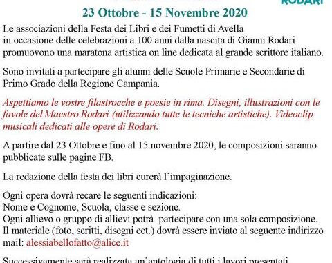 Le associazioni della Festa dei Libri e dei Fumetti di Avella in occasione delle celebrazioni a 100 anni dalla nascita di Gianni Rodari, con il patrocinio della Regione Campania, della Provincia di Avellino, dell’Ente Regionale Parco del Partenio, del Comune di Avella e dell’associazione delle piccole imprese PMI International, promuovono una maratona artistica on line dedicata al grande scrittore italiano. Ancora una volta il Covid 19 non ferma le associazioni promotrici della più bella kermesse culturale dell’Irpinia. Dopo il successo dell’iniziativa 100 parole on line, tenuta tra aprile e maggio 2020, questa nuova idea coinvolgerà le scuole della Campania per omaggiare Gianni Rodari, il suo amore per la scuola e per l’educazione culturale dei ragazzi.