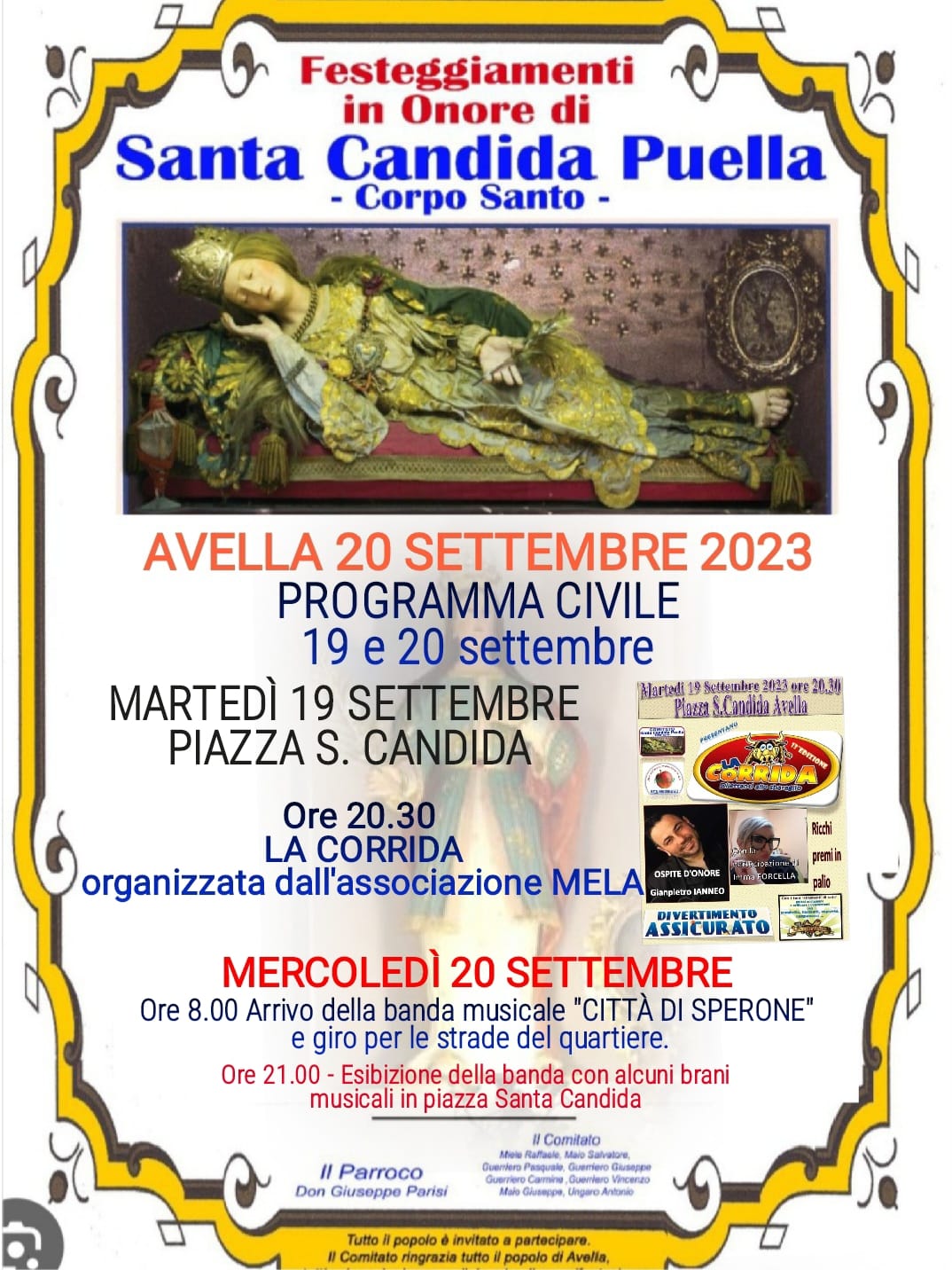 Nel cuore della Campania, nel suggestivo paese di Avella, si celebra ogni anno una festa che decisione la comunità locale in un’atmosfera di devozione, gioia e tradizione. La festa in onore di Santa Candida è uno tra gli eventi più importanti per gli abitanti di Avella, un momento di spiritualità e festeggiamenti che unisce le generazioni e rafforza il legame tra la comunità e la sua santa. Santa Candida  è una figura di grande importanza nella tradizione religiosa locale. Si dice che abbia compiuto numerosi miracoli durante la sua vita e che continui a intercedere per gli abitanti di Avella. La festa è stata celebrata per la prima volta nel 1580, e da allora è diventata un punto di riferimento nella vita della comunità.