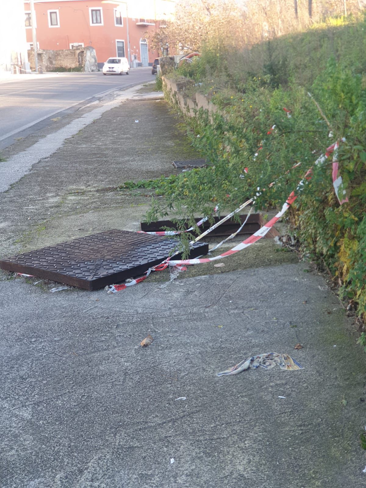 Le immagini inviate dai residenti mostrano chiaramente il dissesto, l’acqua stagnante, i detriti accumulati e il tombino scoperchiato che resta pericolosamente esposto.