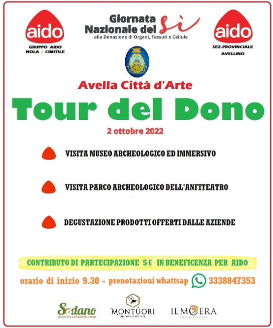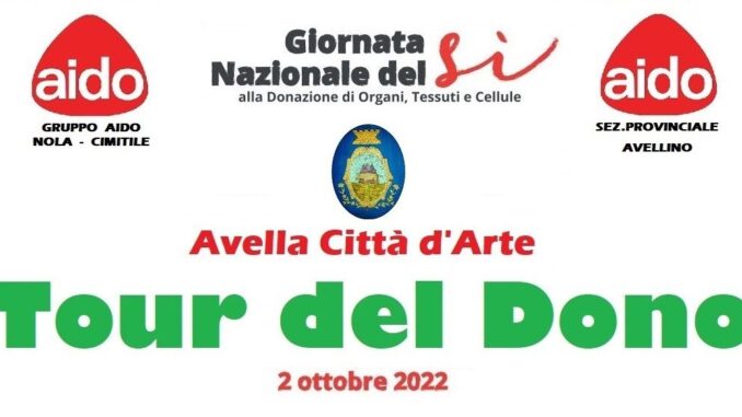 Ad Avella la giornata si celebrerà con il “Tour del Dono” organizzato dai gruppi AIDO Nola e Cimitile e la sezione di Avellino in collaborazione con il Comune di Avella e le aziende “Moera”, “Sodano” e “Montuori”. Il Tour praticamente prevede la visita a partire dalle ore 9.30 al Museo Archeologico ed Immersivo MIA, poi a seguire i partecipanti raggiungeranno il Parco Archeologico dell’Anfiteatro e ci sarà anche una degustazione. E’ prevista la quota di partecipazione di 5 €, che sarà interamente devoluta in beneficenza all’AIDO. Per prenotare è attivo il contatto WhatsApp: 3338847353.