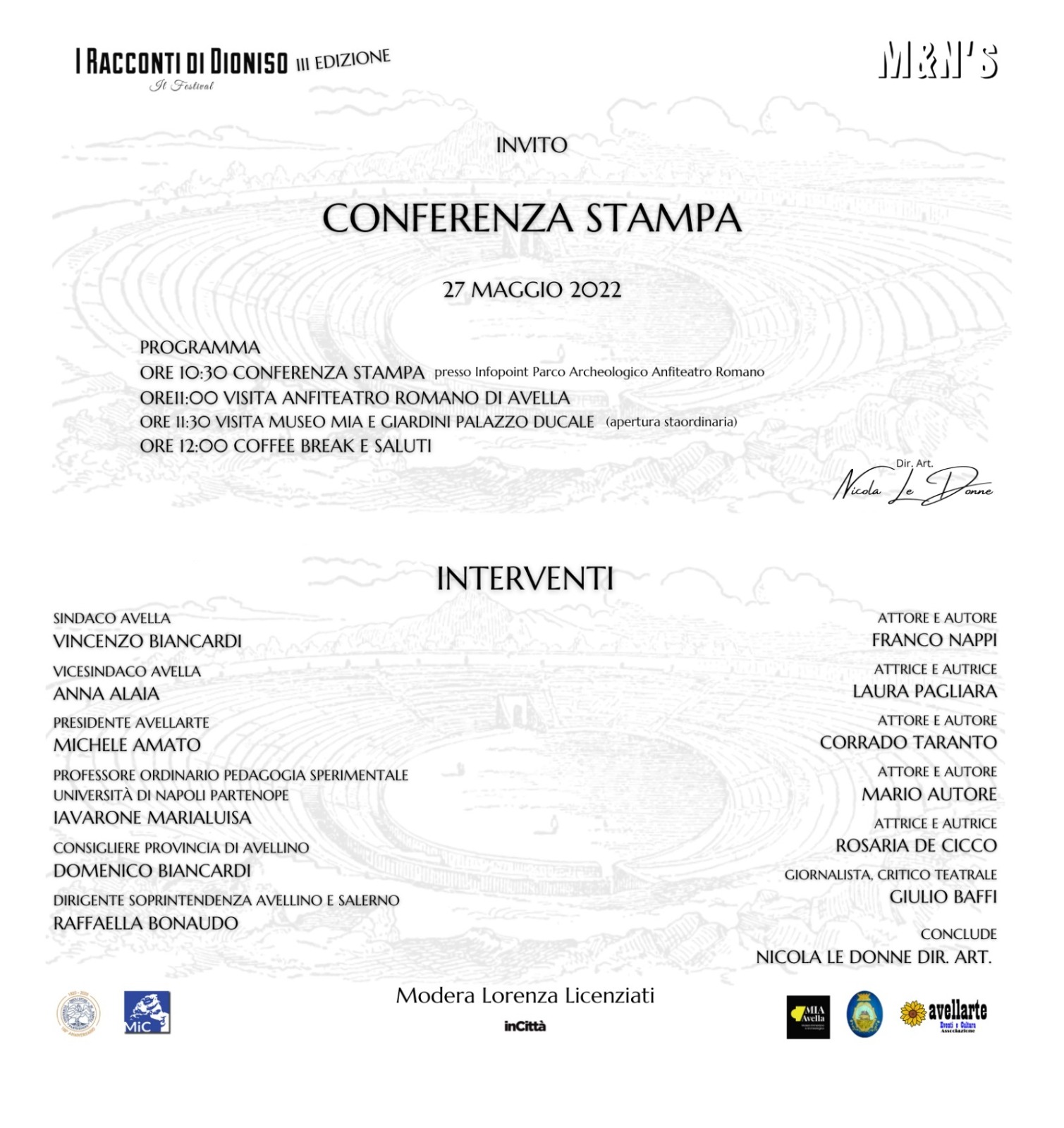 Venerdì 27 maggio, ore 10.30 all’Infopoint Parco Archeologico Anfiteatro di Avella al via la III edizione de “I Racconti di Dioniso”, la kermesse di teatro itinerante a cura di Nicola Le Donne, che avrà luogo ad Avella, dall’11 giugno al 18 settembre 2022, in 12 appuntamenti e tre differenti location: l’Anfiteatro Romano, le Tombe Romane e il Teatro Biancardi. L’evento sarà presentato in conferenza stampa dalla giornalista Lorenza Licenziati, venerdì 27 maggio alle ore 10.30, presso l’infopoint del Parco Archeologico Anfiteatro Romano; seguirà la visita guidata all’Anfiteatro di Avella e la visita al Museo Mia e ai Giardini di Palazzo Ducale, aperti eccezionalmente per l’occasione. Nel corso della conferenza sarà divulgato l’intero programma della rassegna. Tanti i nomi di rilievo del teatro e della critica teatrale coinvolti per questa edizione, che presenta tra le novità l’unione di spettacoli e workshop dedicati all’arte della recitazione e un premio finale a chi ha dato lustro e si è adoperato per divulgazione della cultura e del Teatro Greco-Romano.