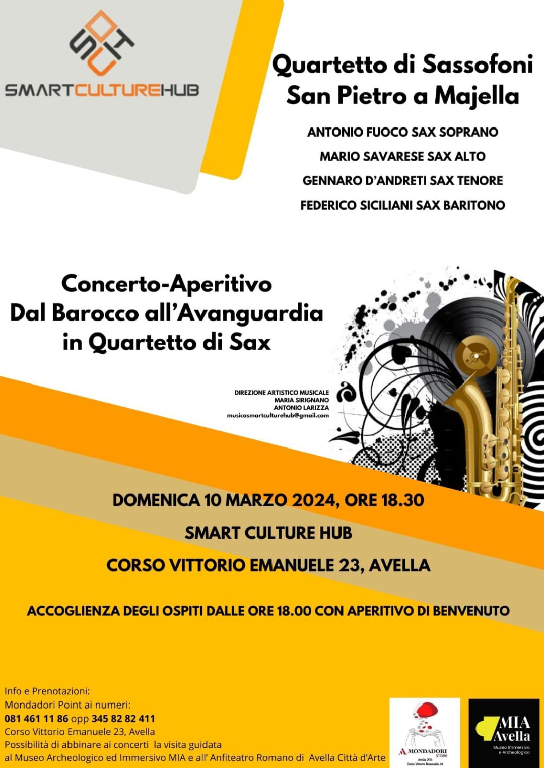 Il secondo appuntamento con la rassegna “Serate Armoniche” propone, domenica 10 marzo, l’esibizione di un quartetto di sassofoni San Pietro a Majella per un concerto-aperitivo dal titolo “Dal barocco all’avanguardia in quartetto Sax” . Al sax soprano Antonio Fuoco, sax alto Mario Savarese, sax tenore Gennaro D’andretti e sax baritono Federico Siciliani con la direzione artistica e musicale di Maria Sirignano e Antonio Larizza. L’accoglienza dei partecipanti è prevista per le ore 18.00 presso lo SmartCultureHub sito in Corso Vittorio Emanuele Avella 23 (Av) dove si consumerà un aperitivo e successivamente si potrà assistere al concerto che avrà inizio alle 18.30. Possibilità di abbinare al concerto la visita al museo archeologico MIA di Avella e all’Anfiteatro prevista tra dalle 16.30 alle 18.00.