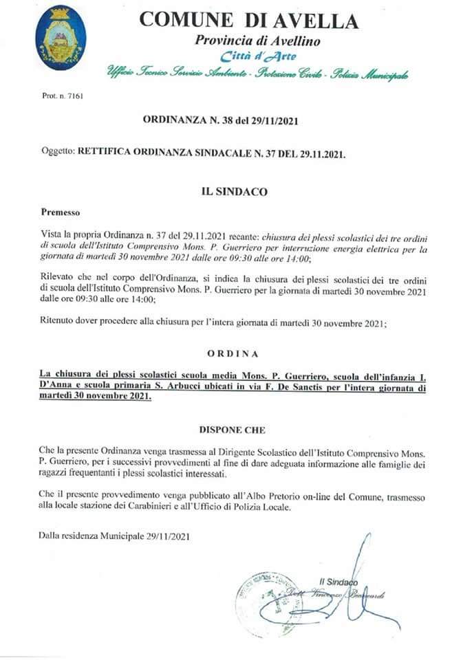 AVELLA. Il sindaco emette ordinanza di chiusura dei plessi di via De Sanctis. L’ordinanza 29/11/2021 binews.it ATTUALITA', AVELLA, EVIDENZA 0 Il primo cittadino di Avella ha emesso ordinanza di chiusura di tutti i plessi scolastici di via De Sanctis (Infanzia, Primaria e Secondaria), per la giornata del 30 novembre 2021. La causa è per l’assenza di energia elettrica della zona .